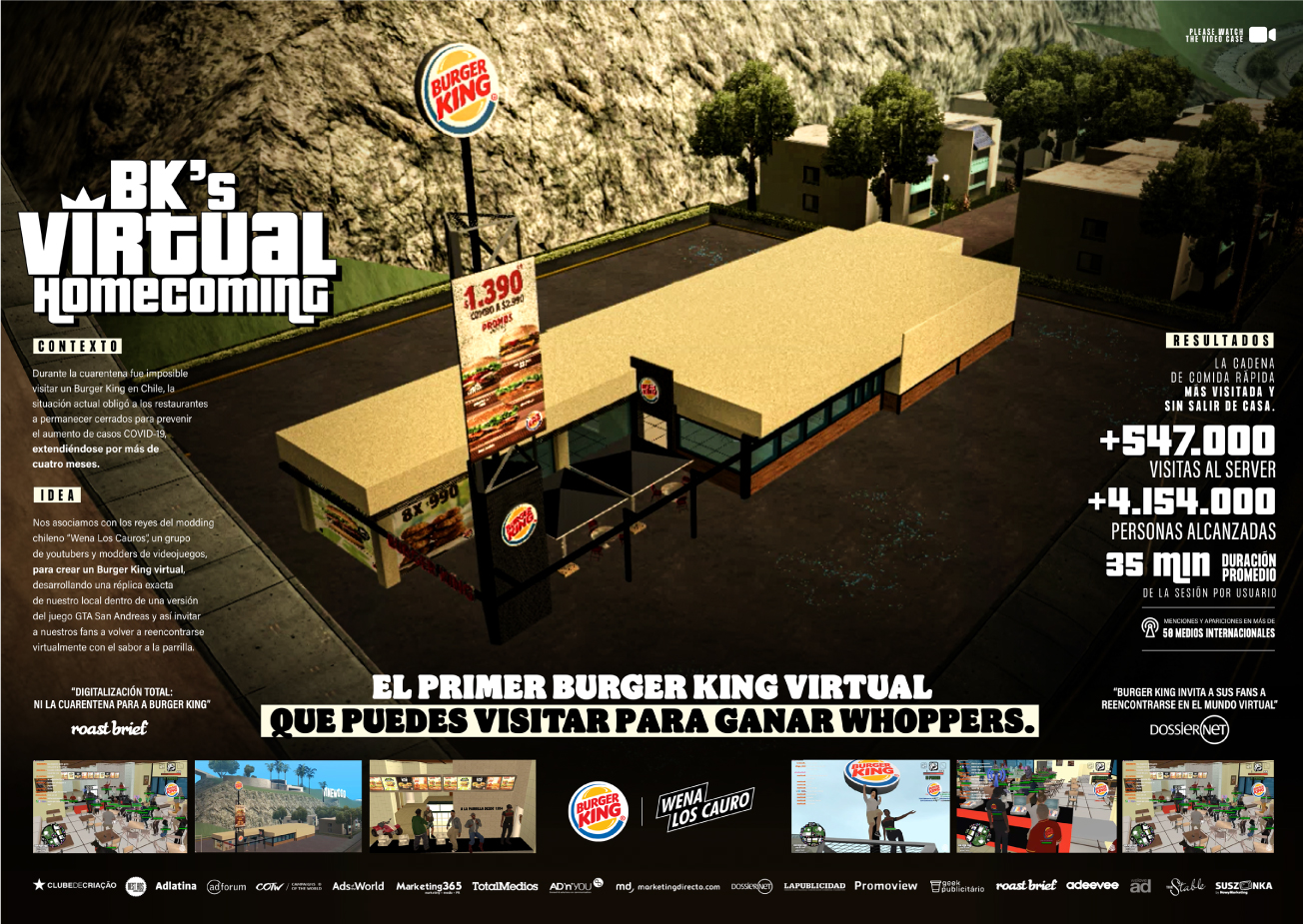 During the quarantine, it was impossible to visit a Burger King, which is why we partnered with the Chilean modding kings «Wena Los Cauro» to create the first online Burger King and win real-life Whoppers.